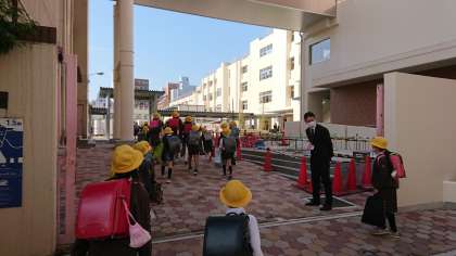 正門を北側に新設したたので、今日もPTAの方が交通安全の登校指導を行ってくださいました。