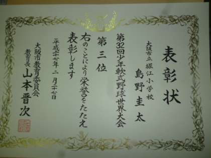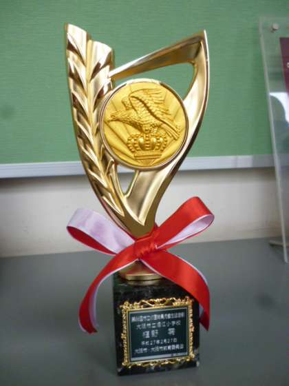 2月27日に水泳で教育長表彰された植野零君のトロフィーと、軟式野球の島野圭太君・浅利太門君の賞状です。