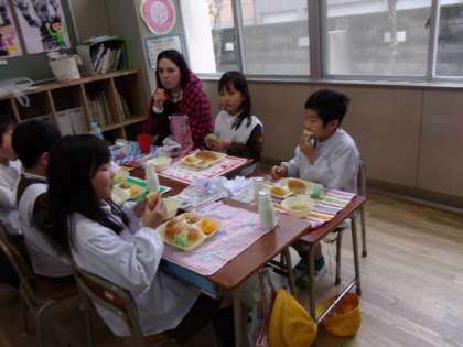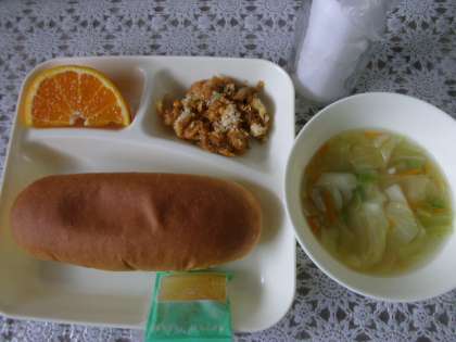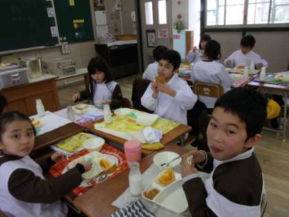 今日の給食は「大型コッペパン、りんごジャム、とうふのミートグラタン、麦と野菜のスープ、デコポン、牛乳」でした。香ばしい焼き目のついたグラタンは大好評でした。スープは、野菜の中に押し麦が入りつるんとした食感が楽しめました。デコポンはスマイルカットに切ってあったので、1年生でも自分でむいて食べることができました。今日はイングリッシュディで、留学生の方たちと一緒に楽しく給食時間を過ごしました。