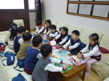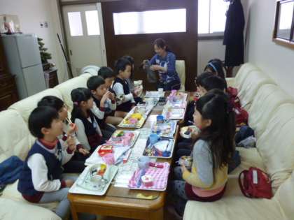 先週2回、昨日、今日とで4回に分かれて、やま組うみ組の堀江幼稚園の園児が校長室で昼食会をしました。