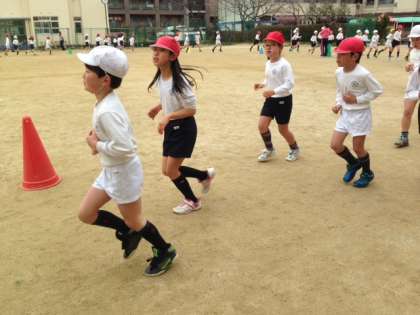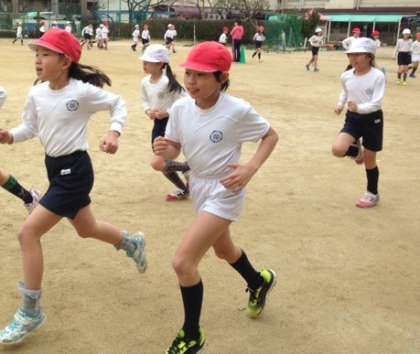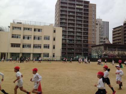 今日は4クラス合同での体育の授業でした。最初は、五分間走(持久走)です。