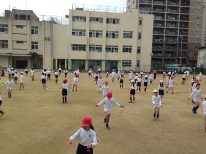 五分間走のあとは、音楽に合わせてなわとびを跳びました。音楽のテンポが少しずつ速くなっていきます。