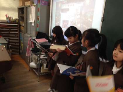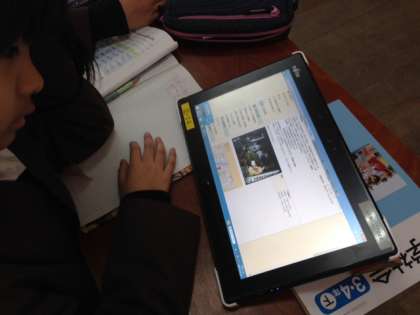 タブレットを使い、大阪に昔から伝わる行事やお祭りについて、インターネットで調べました。調べて分かったことをまとめ、友だちと意見を交流しました。電子黒板を使い、発表もしました。