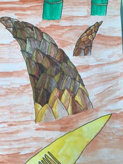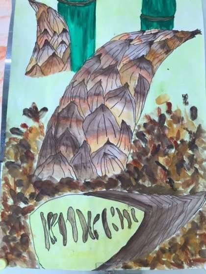 図画工作科で、たけのこを描きました。本物のたけのこを半分に切って見たときには、みんな「わあっ!」と目を丸くして驚いていました。初めてのグラデーション技法。増やす絵の具の色や量を考えたり、水の量を加減したりしながら、やっと完成しました。難しかったけれど、みんなよくがんばりました!