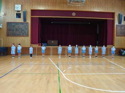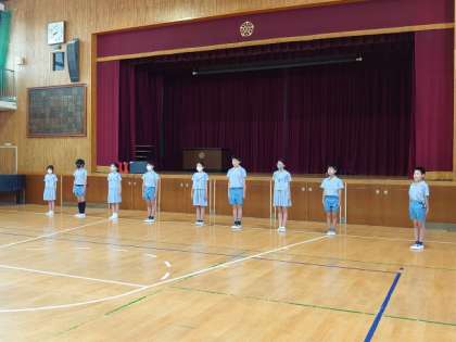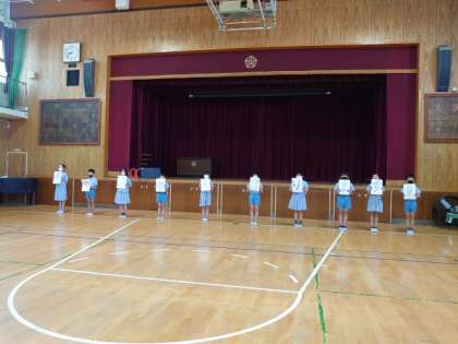 今日の児童集会では、前期運営委員の人たちがあいさつをしました。