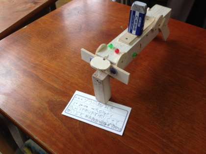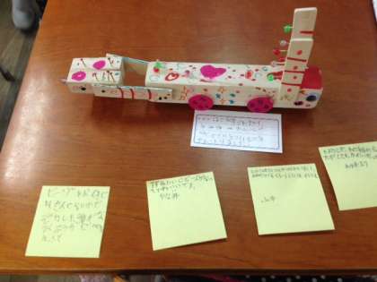 「くぎうちトントン」の作品が出来上がりました。自分の紹介カードを添えて、教室で“展示会”をしました。友だちの作品の良いところを見つけ、みんながコメントを貼り付けていきます。