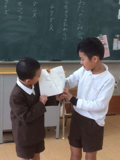 下の写真は、プログラム9番恐竜の話です。エニオサウルスやスピサウルスなど、絵を描いて話をすることを頑張りました。