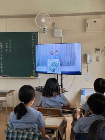 式の様子はテレビ中継されて、全校児童が参加しました。