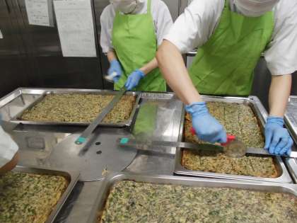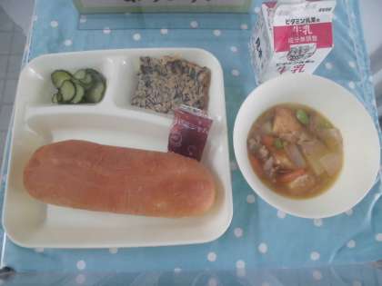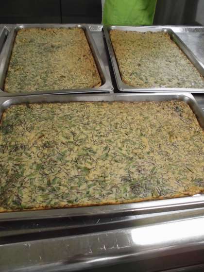 今日の給食に「もずく入りヒラヤーチー」が登場しました。ヒラヤーチーは、沖縄の家庭料理で「平焼き(平たく焼く)」という意味の料理です。