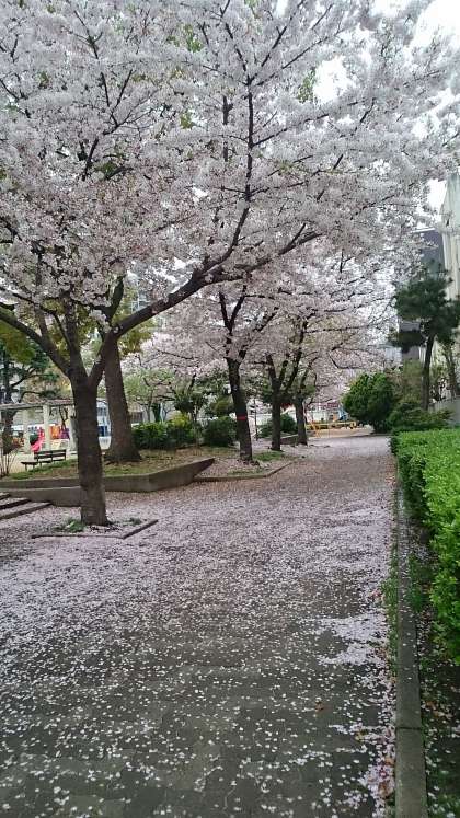 雨の中、桜のじゅうたんを踏みしめて2年生と6年生が明日の入学式の準備に登校します。