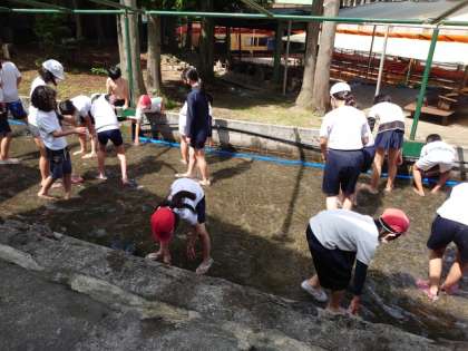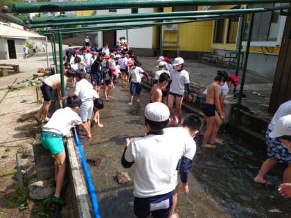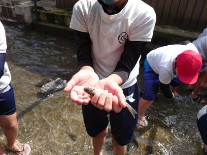 5年生 林間学習「魚つかみと川遊び」
