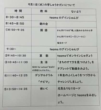 2年生 9月1日(水)が臨時休業になった場合の学習課題について
