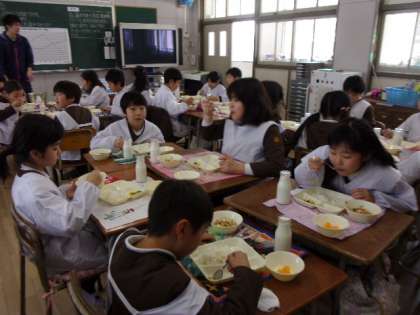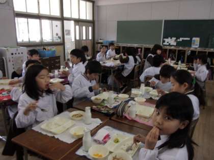 4年生の教室でも、楽しそうに給食を食べています。マーボーどうふは人気のあるメニューのひとつなので、どんどんおかわりをして空っぽになっていました。