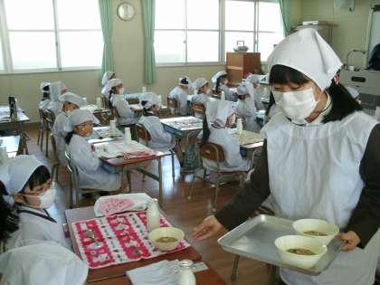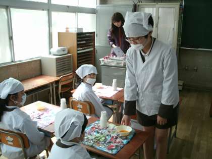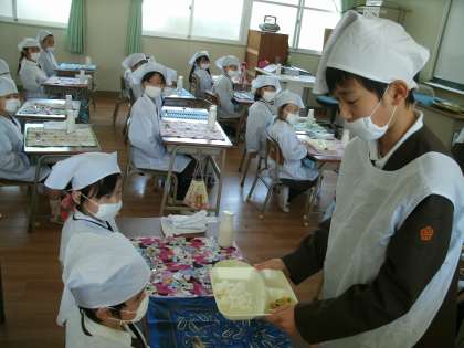 一年生に給食配膳の仕方がうまく伝わるようにがんばりました。