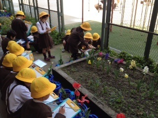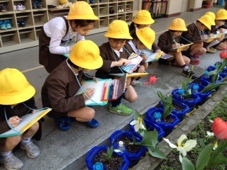 1年生のときに植えたチューリップの観察をしました。花びらの形をみたり、さわったりしながら、じっくり観察し、みつけたよカードに記録しました。