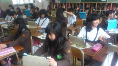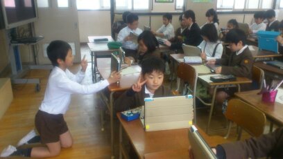 タブレットで自分の顔を撮影し、その写真をよく見ながら似顔絵を描きました。
