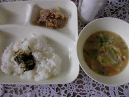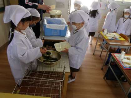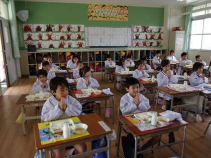 今日で9回目の給食時間です。準備の方法も分かってきてスムーズに運ぶことができるようになってきました。「はやくたべたいな!」という声が聞こえてきました。