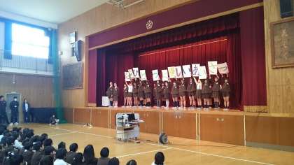 前期児童会が「意気込み」の発表と「スローガンー心をひとつに優しいあいさつー」を発表しました。