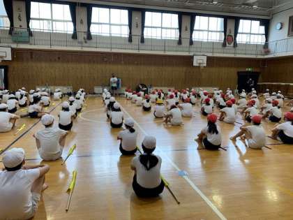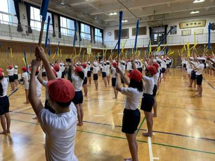 フラッグの練習が始まりました。子どもたちは、友達との連動やキレのある技を目指し頑張っています。