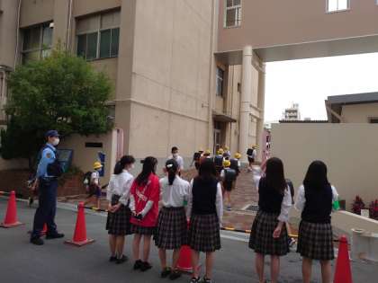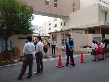 今週、西警察署と市立西高校の生徒のみなさんがボランティアで、朝の登校時に見守り活動をしてくれています。