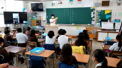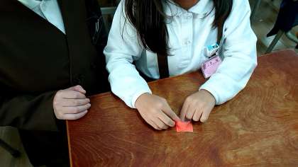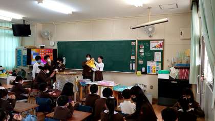 今週は朝の学習前の時間を使って、6年生が修学旅行で持っていく平和の折り鶴を各学年に教えに行っています。