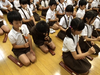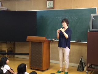 リコーダーの種類についての話の後、吹く時の注意を聞いて実際に自分たちのリコーダーを吹いてみました。