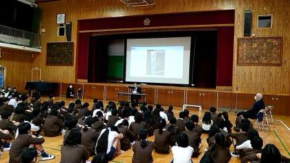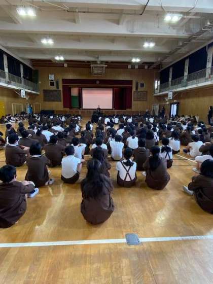 講堂には5年生と6年生が代表で集まり、他の学年は教室でのリモート参加です。
