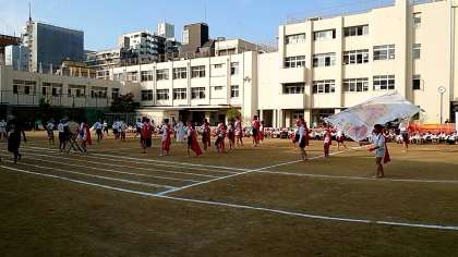 運動場では6年生が参加し、他の学年は教室でのTeams参加です。