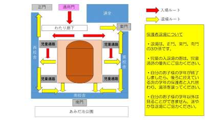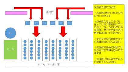 運動会当日の保護者の皆様の入退場の図を以下に示しています。