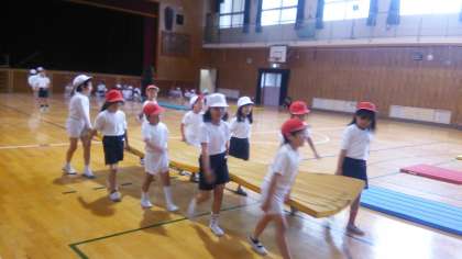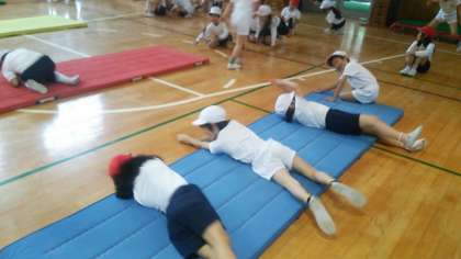 5月の講堂での体育は、マットあそびです。