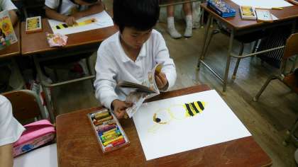 生活科のてのひらずかんの、みつばちの写真を見ながら真剣に描いていました。