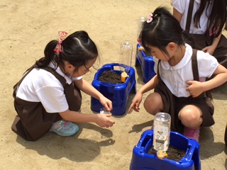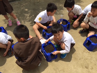 自分の植木鉢に土を入れ、指でそっと穴をあけ、その穴に種を入れました。