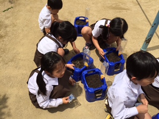 「早く芽が出るといいな。」と気持ちをこめて、水をやりました。