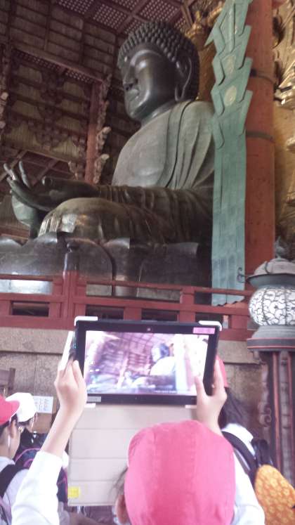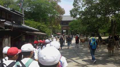 遠足で、奈良公園に来ています。車窓から見える平城京や、奈良公園に着いてからの東大寺南大門、大仏、興福寺の五重塔など、社会科で学習した建物などを実際にみて感動していました。