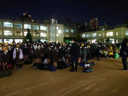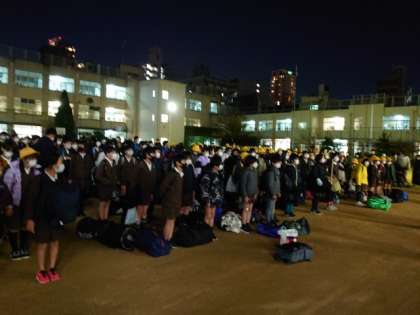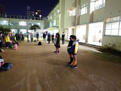 すっかり暗くなった運動場で帰校式をしました。