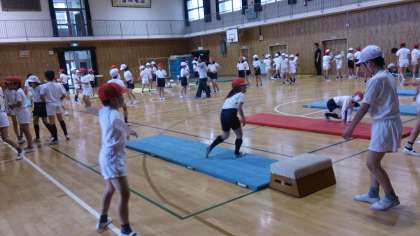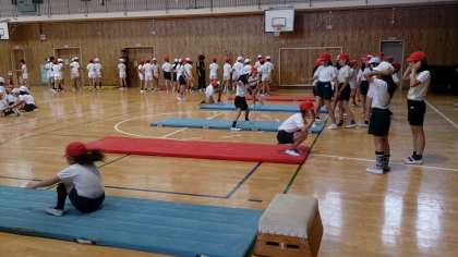 体育でマット運動をしました。どうすれば上手く回転することができるのか、友だちとアドバイスし合いながら練習しました。