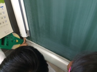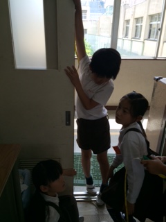 班の人と協力し、途中で曲がらないように真っ直ぐ物に当てて測りました。班の人と協力することによって、長いものを測ったり、バケツのまわりを測ることができる巻尺の利便さに気づくことができました。