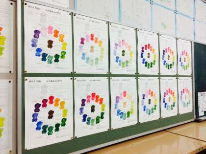 みんなの作品を見て、「次は自分のかいた絵にいろんな色をつけたいな〜。」
