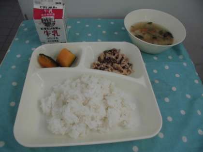 「干しずいき」とは、サトイモの葉柄のことで、カルシウムや鉄、食物繊維が多く含まれています。昔から食べられてきた乾物のひとつとして児童に伝えていきたい食材です。給食ではみそ味にして食べやすくしています。