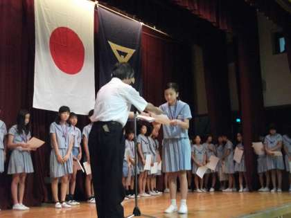 講堂で行った始業式では、夏休みの反省と2学期の過ごし方(早寝、早起き、しっかり朝ごはん)を確認しました。また、夏休み中に開催された学童泳力記録会やスポーツ交流会(陸上)、ミニバスケット大会等の入賞者に賞状とメダルが授与されました。