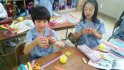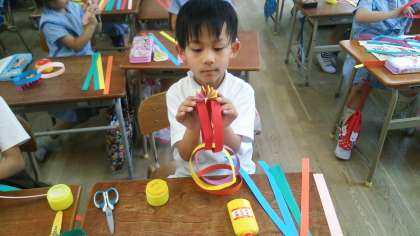 できたかざりを、友だちと見せ合ったり、先生に見せたりして楽しそうに作っていました。
