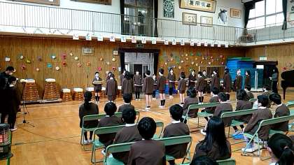 在校生からは、たてわり班で作ったメッセージを、お返しに卒業生からは手作りの雑巾と合唱・合奏をプレゼントしました。