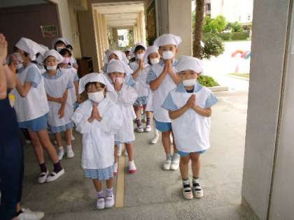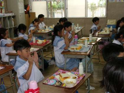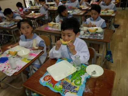 1年生は、配られた給食の大きなメロンを見て、「はやく食べたいなぁ!」と口々につぶやいています。今日は食パンにつけるはちみつが、初登場だったので、最初にはちみつのチューブの開け方を聞きました。カレードリアは、ちょっと焦げ目があり大好評でした。