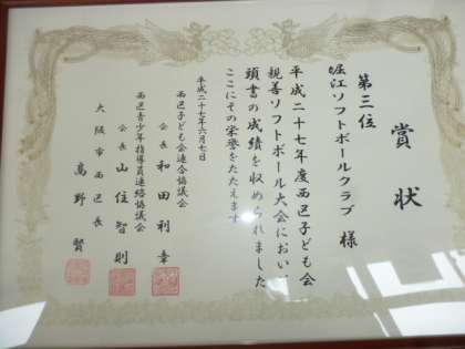 「堀江ソフトボールクラブ」に賞状の授与を行いました。