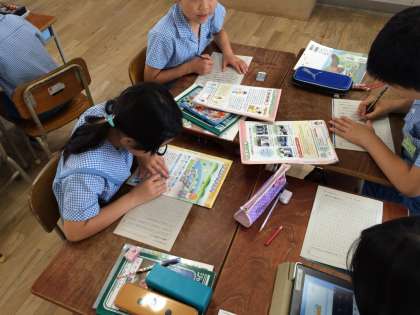 国語の学習で新聞作りを行っています。ごみや水道など、自分の好きなテーマを選び、それに合った記事を書く学習をしました。どんな新聞ができるか楽しみですね。