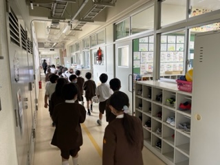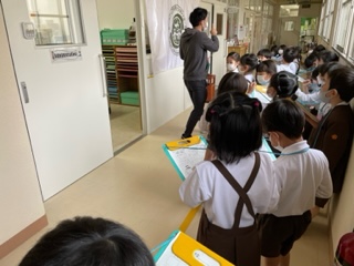 そんな中、先週には、2年生のお姉さんやお兄さんから学校のいろいろな特別教室や施設について教えてもらいました。そのことをもとに、1年生の子どもたちが学校たんけんを行いました。広い校舎中を先生や友だちと見て回る姿は、楽しそうでもあり興味津々の様子でした。