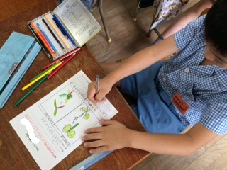 今、学習園で育てているホウセンカとマリーゴールドの観察をしました。観察している中で、種や葉の形は違うけれど、育ち方が似ているということに気付いたり、出てきた芽になぜ種の殻がくっ付いてるんだろうという疑問を持ったりすることができました。これからの成長も楽しみにしている様子です。