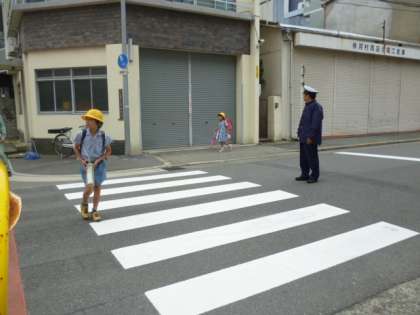 西警察 堀江交番から登校の見守りを行っていただきました。