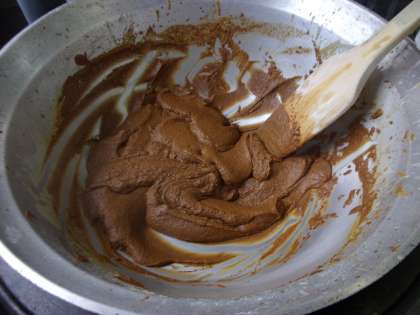 ミートソースは、牛挽肉、豚挽肉だけでなく、小麦粉を油でいためて作ったブラウンルウを入れて煮込みました。クリームシチューのホワイトルウは、焦がさない様に白く仕上げましたが、ブラウンルウはしっかり褐色になるまで炒めました。とてもおいしいミートソースに仕上がりました。