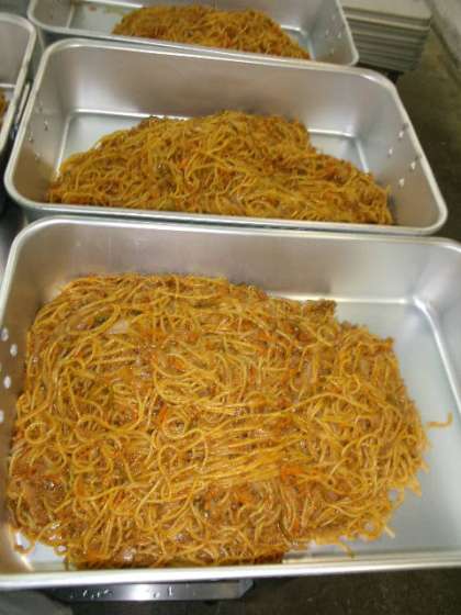 出来上がったスパゲッティのミートソースは、めんがつぶれない様に、大きなバットに入れて教室まで運びました。